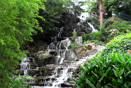 沿著潺潺溪水,拂開柳樹的萬條綠絲,踏著石砌小路拾級而上,聽到水聲漸響,千層疊瀑如巨幅的國畫展示在眼前。