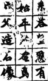 《龍門二十品》是龍門石窟中的二十尊造像的題記拓本,北魏書風(fēng)的代表作?涤袨榉Q龍門石刻“皆雄峻偉茂,極意發(fā)宕,方筆之極規(guī)也”。而《始平公造像》又是龍門石刻中的代表作。立于太和二十二年(498)。此碑與其它諸碑不同之處是全碑用陽刻法。筆畫折處重頓方勒,鋒芒畢露,顯得雄峻非凡。