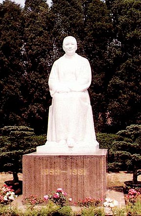 宋慶齡漢白玉雕像坐落在紀(jì)念廣場(chǎng)北部中央。雕像的設(shè)計(jì)經(jīng)全國征稿選出,在著名雕塑家劉開渠的指導(dǎo)下塑成,雕像高2.52米,取用宋慶齡最具風(fēng)采的50歲左右的形像,身穿旗袍及她出訪錫蘭(今斯里蘭卡)時(shí)所穿的圓翻領(lǐng)上衣,頭梳發(fā)髻,雙手交叉疊放在膝上,面含微笑,顯示出高風(fēng)亮節(jié)的氣質(zhì)和慈祥的風(fēng)度。