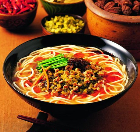 小鍋米線是一道“工夫菜”。。。在昆明任何一家普通米線館里你都可以看到這樣的場景: 大師傅把原料,調(diào)料都準備好,分別用統(tǒng)一的碗盆盛了,整齊的排在一邊案上.新鮮米線是用碗一碗碗備好盛了摞在案上的,中間案上就是一組六眼或八眼的專門做小鍋煮品的強火灶眼,另一邊是只熬著筒子骨湯的大鍋.這小鍋灶上可就精彩了——八只十八公分直徑的黃銅帶直把的小鍋,大小也就一吃面條的碗一般.每只鍋里的內(nèi)容各有千秋,卻全都是五彩繽紛熱氣騰騰.煮米線的師傅右手一柄湯勺,從右邊一個喧沸的大鍋里舀起一勺高湯倒進小銅鍋里,同樣是那把湯勺,在左邊案上舀半勺肉末和一點豬油放進滾湯里,隨意瀟灑的攪拌三兩下,左手嫻熟的依次放入姜末, 酸腌菜,然后抬起一碗米線,右手順勢用湯勺擋一下,米線嘩啦就下了鍋,再順手一勺醬油.右手的大湯勺在盛放胡椒味精的盆盆里如蜻蜓點水輕快的一沾,抄進小銅鍋.等鍋開了把韭菜,豆芽,豌豆尖兒抓進鍋,再放一勺辣椒油.最后,取一塊白抹布擱在左手上,一把握住小銅鍋的木柄,對著右邊案上的空碗,"嘩",一碗紅的白的綠的褐的粉的熱氣騰騰香味撲鼻的小鍋米線就出鍋了.再順勢抓一撮鮮綠的芫茜蔥花撒在面上,猶如畫龍點睛之筆,頓時一碗湯熱,味鮮,爽口的小鍋米線就活了.整個過程如行云流水,一氣呵成.,微微的,恰到好處的一點酸味,鮮味,甜味和辣味,深得中庸之道......