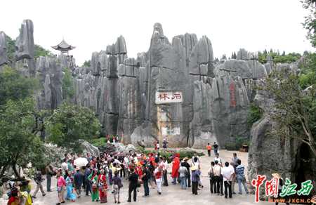 7日下午,首屆中國網(wǎng)絡(luò)媒體云南行記者團(tuán)一行來到昆明市石林景區(qū)參觀。(中國江西新聞網(wǎng)記者 鄧小勇 攝)