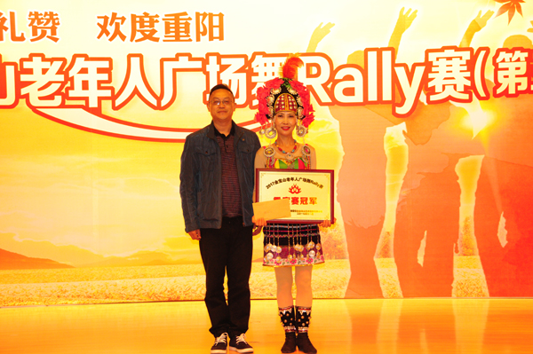 金寶山銷售公司總經(jīng)理沈勇為獲得總決賽冠軍的西山區(qū)文工團頒發(fā)獎牌和獎金。