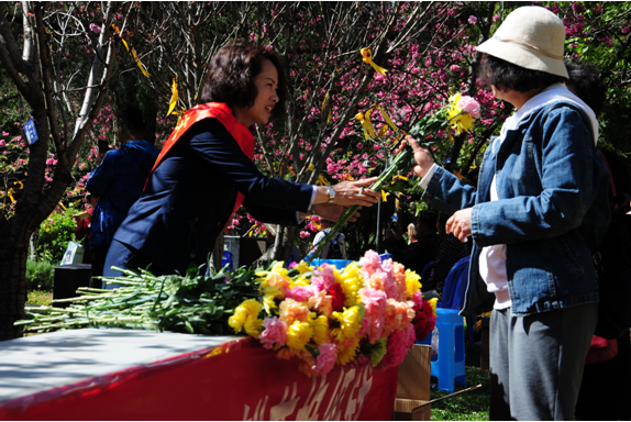 清明是一年之中萬物勃發(fā)、最具生機(jī)的節(jié)日。在這個日子里,既充滿了懷念故人的情懷,也洋溢著人們外出踏青、享受萬物復(fù)蘇的熱情。此時正值人間四月天,花事正濃,百花齊放,春色滿園。在那櫻花盛開的地方,“雅韻追思”優(yōu)雅的曲調(diào),正伴著陣陣花香和縷縷清風(fēng),緩緩的飄蕩到人們的耳中。黃絲帶系在正在盛開的櫻花枝頭上,人們聆聽的不僅僅是那個崢嶸歲月的故事,也追憶著當(dāng)年那份難忘的情誼。這將傳統(tǒng)節(jié)日與當(dāng)下生活的多姿多彩完美融合,是金寶山堅持13年的清明文化理念之一。