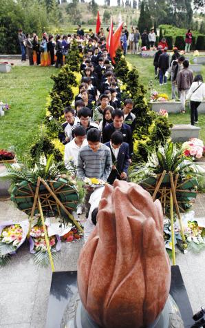 給軍魂園火炬送上鮮花 記者龍宇丹/攝 當(dāng)同學(xué)們把一朵朵寄托追思的白菊花、黃菊花在先輩們的墓前獻(xiàn)上時(shí),他們的表情莊嚴(yán)而凝重,這一刻這群年輕人的心里充滿了對先輩的敬重和對生命的思考。