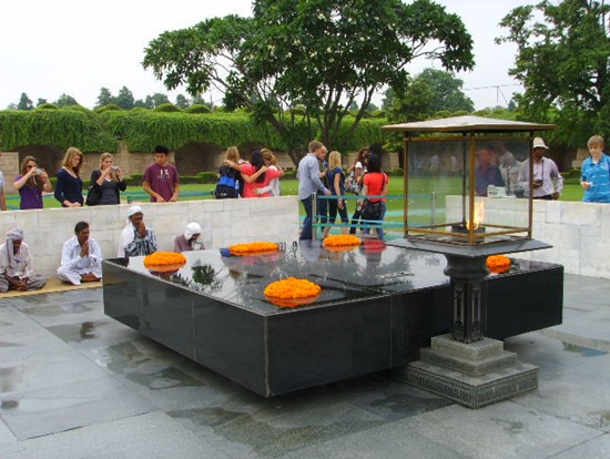 甘地墓在新德里東北部的朱木拿河畔,占地開闊,但真正的墓園卻不大。我按印度人的習慣,赤腳進入,手上捧著花。墓體為黑色大理石,約十六平方米,四周有矮墻,矮墻外面是草地,草地延伸到二十米遠的地方,有一圈黃石高臺,把整個墓園圍住。