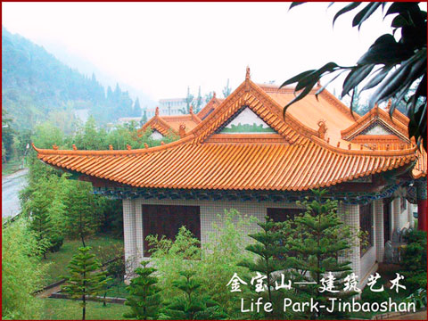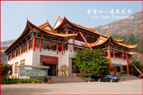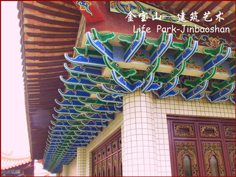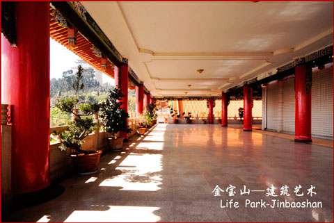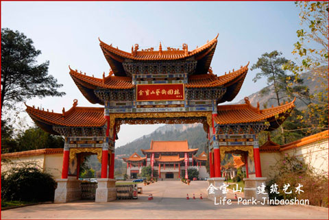 金寶山主建筑群是典型的明清風(fēng)格,紅柱高擎、重檐舒展,琉璃瓦金色耀眼。三重檐七斗拱的大門,中國書法家協(xié)會會長劉藝先生題寫的“金寶山藝術(shù)園林”幾個大字熠熠生輝。