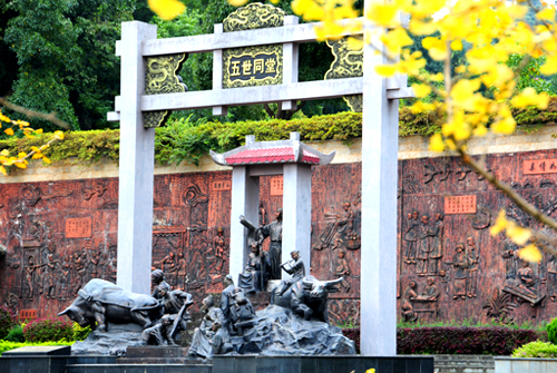 五世同堂親情廣場由主雕塑和背景浮雕兩部分組成,它以中國傳統(tǒng)文化為背景,展開了一個大家庭五世同堂的生動畫面。