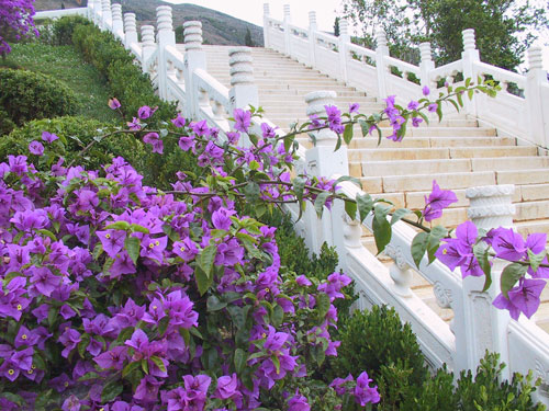 福壽園蜿蜒的石階,適宜緩慢步行登高,西山剛性的碧綠滋潤眼簾,精致的小灌木叢長滿山坡,每一片葉子,都彰顯著地氣的靈秀。石階旁爬滿了藤蔓,向著陽光,盡情的舒展著。這一剛一柔的組合,恰似天成,遙遙呼應(yīng)著著碧水藍天的滇池。