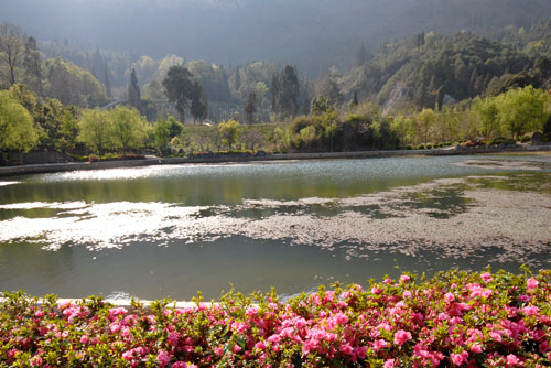 青山巍然在后,兩側(cè)山林圍合,前方是天池的一泓清水,蒼松翠柏之中,錦庭花園若隱若現(xiàn)。在大氣磅礴大氣的金寶山藝術(shù)園林中,40多畝的錦庭花園猶如一個(gè)精致的私家花園。