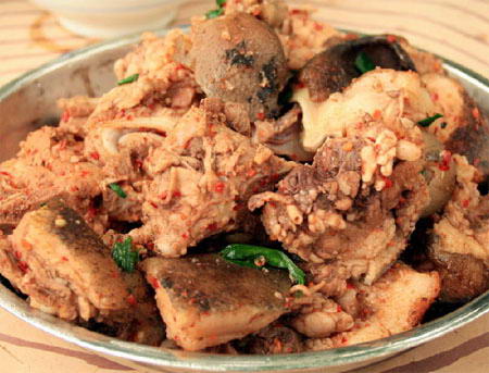 彝族砣砣肉大凡來到麗江地區(qū)寧蒗縣(俗稱小涼山)的游客,都要品味一番彝族的砣砣肉。小涼山彝族的砣砣肉類似新疆的“手扒羊肉”,在制作上,一 般是用鮮活肥碩的豬、牛、羊,立即宰殺后,大塊剁頤,小者如拳、大 者如碗,不放椒鹽,氽入清水中煮至六成熟后,再放在篩簸之中輕輕撒上一層鹽汗水沫,吃時(shí)佐以小涼山土法腌制的一種干酸菜湯(有克油腥 的作用),將砣砣肉抓在手上,邊啃邊嚼,由于這種肉做法特別,又不是很肥,吃起來越嚼越香,越吃越胃口開,所以,砣砣肉如今已成為小涼山的一道很有名氣的風(fēng)味菜。