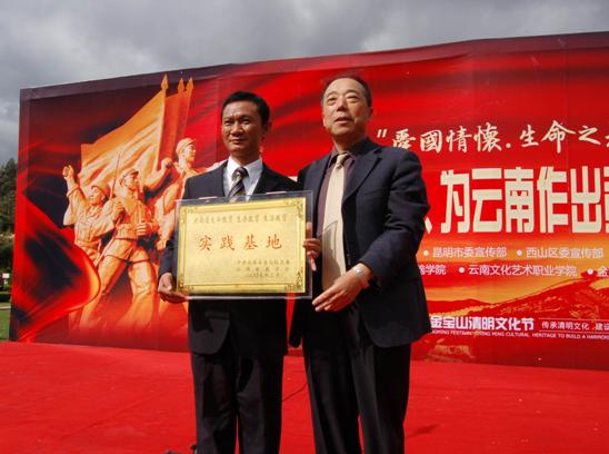 任建軍:金寶山建園九年來,堅(jiān)持突出先烈先輩們的人文價(jià)值,搭建各種不同的活動(dòng)平臺,形成了獨(dú)有的紀(jì)念文化體系,收到了較好的社會效益。黨和政府相關(guān)部門,對我們的工作給予了大力幫助和支持,并充分肯定了取得的成績。去年,中共昆明市委、昆明市人民政府授予金寶山“昆明市愛國主義教育基地”稱號,今天,云南省教育廳又授予金寶山“三生教育實(shí)踐基地”稱號。這對我們的工作是極大的支持和鼓勵(lì),同時(shí)又是動(dòng)力。金寶山將更好地發(fā)揮愛國主義教育和三生教育功能,為構(gòu)建社會主義和諧社會貢獻(xiàn)自己的力量。